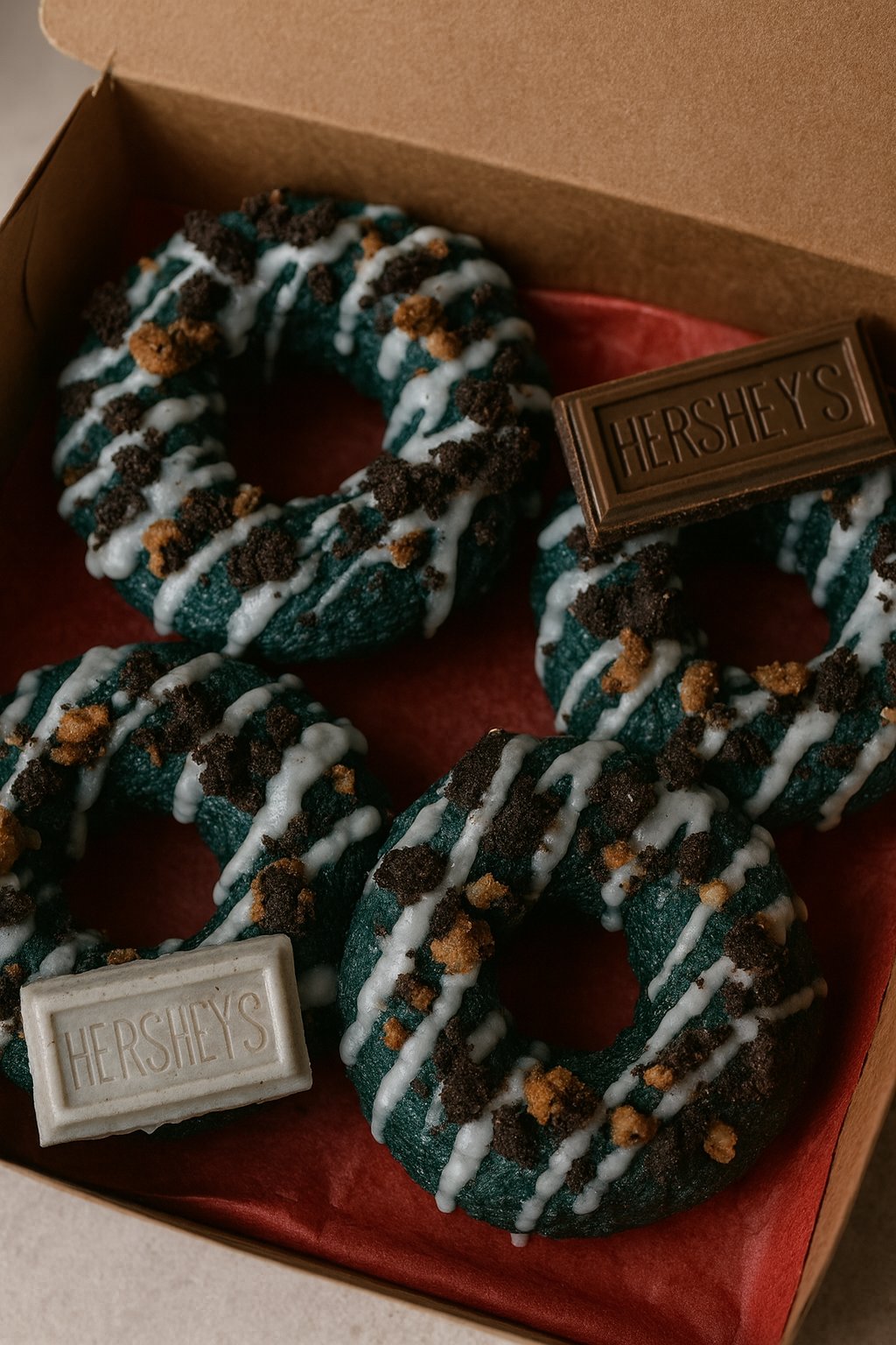 3 Blue Velvet Cookie Monster Donuts topped with Oreos and Chocolate Chip Cookie Crumbles Drizzled with Vanilla Cream Icing paired with mini cookie monster cupcakes